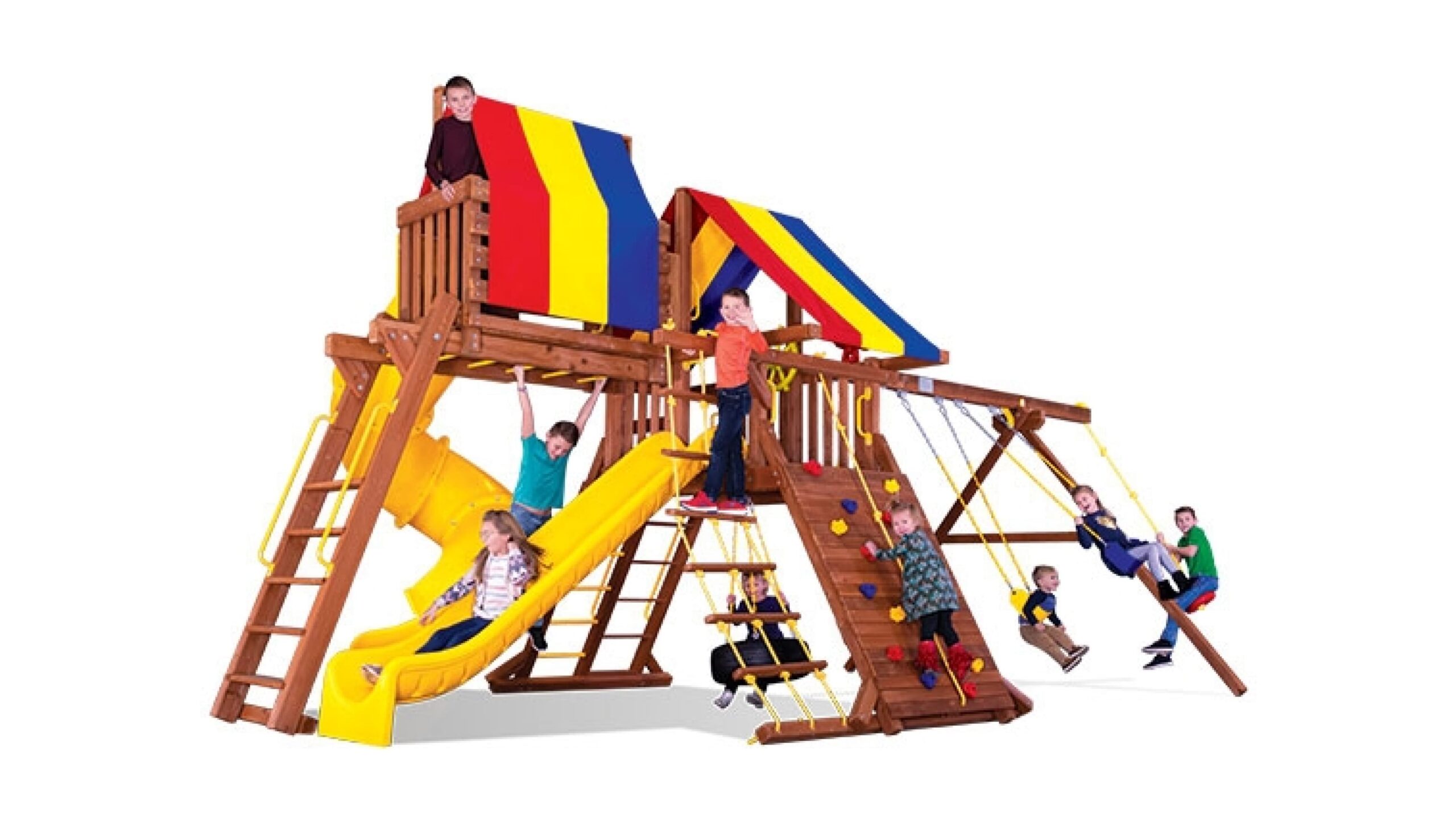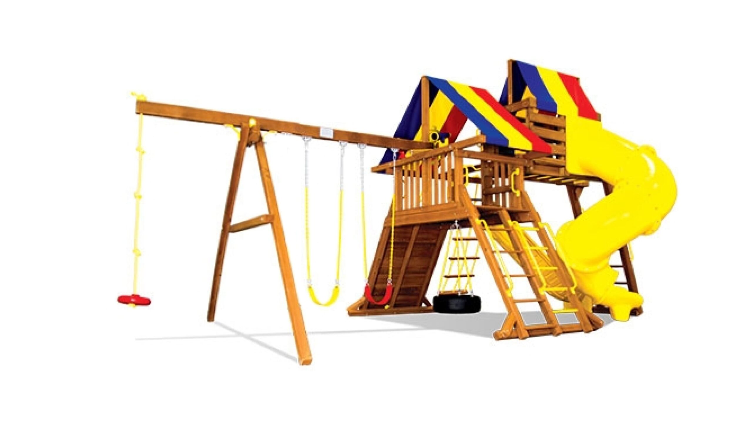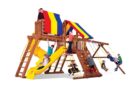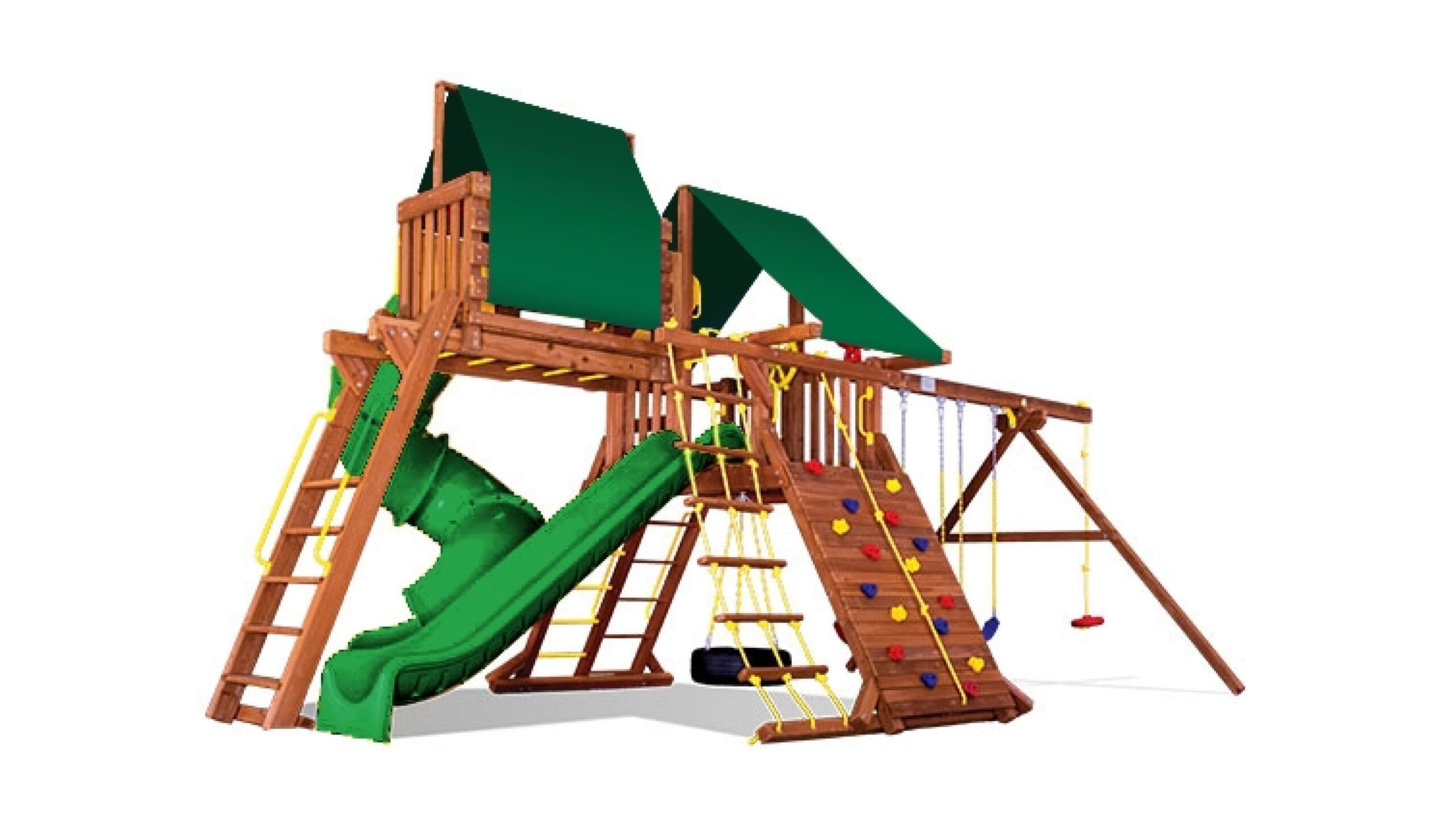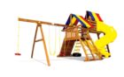 Мощная детская игровая площадка с двумя горками — прямой и горкой-трубой, качелями и домиками позволит разыграться не по-детски! Несколько секций позволят играть двум компаниям разновозрастных детей. Площадка прекрасно встанет на небольшом участке и при этом будет функционировать как полноценная отдельная детская зона. Отличный выбор для загородного дома и ресторанов с летней террасой.