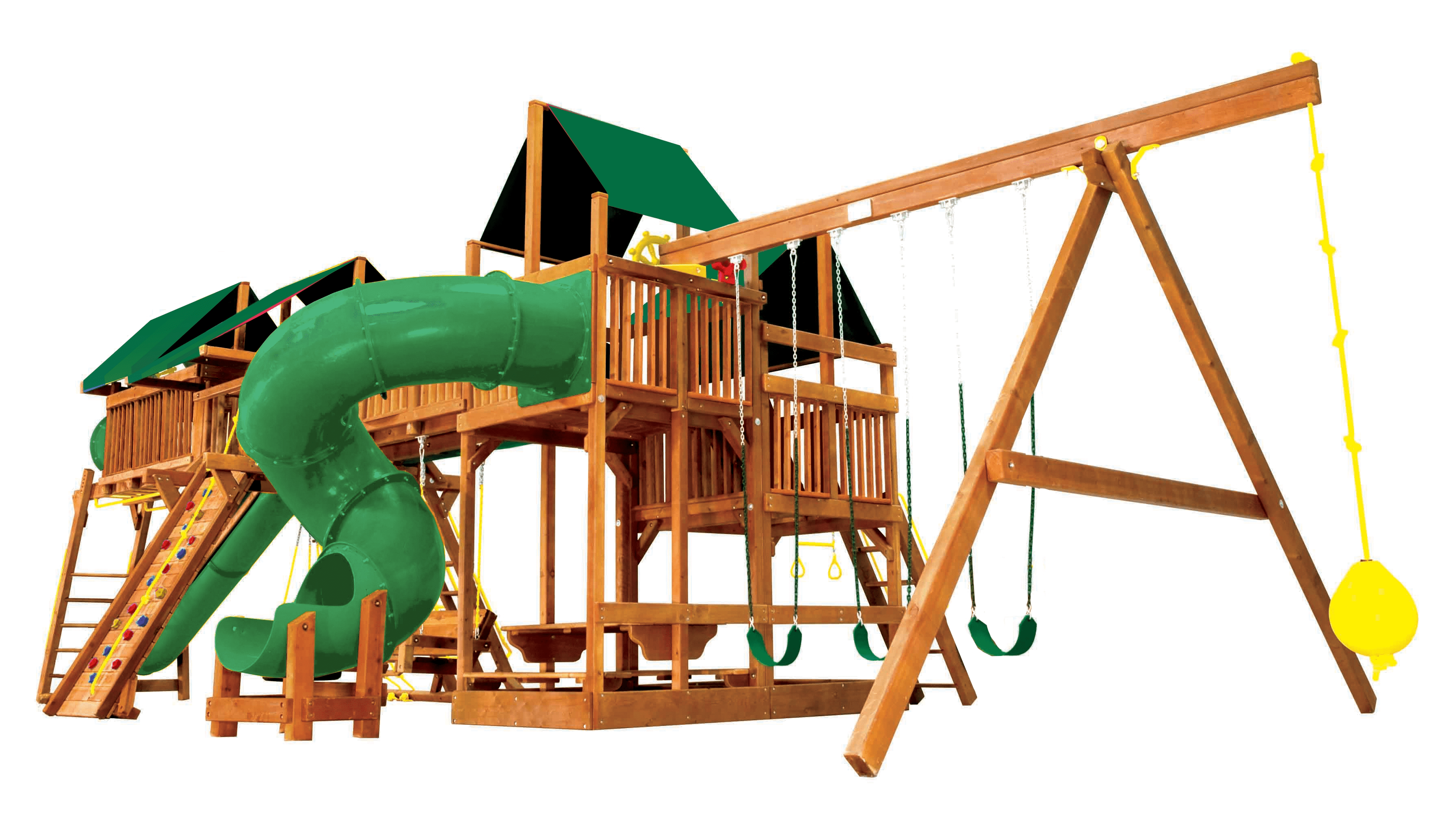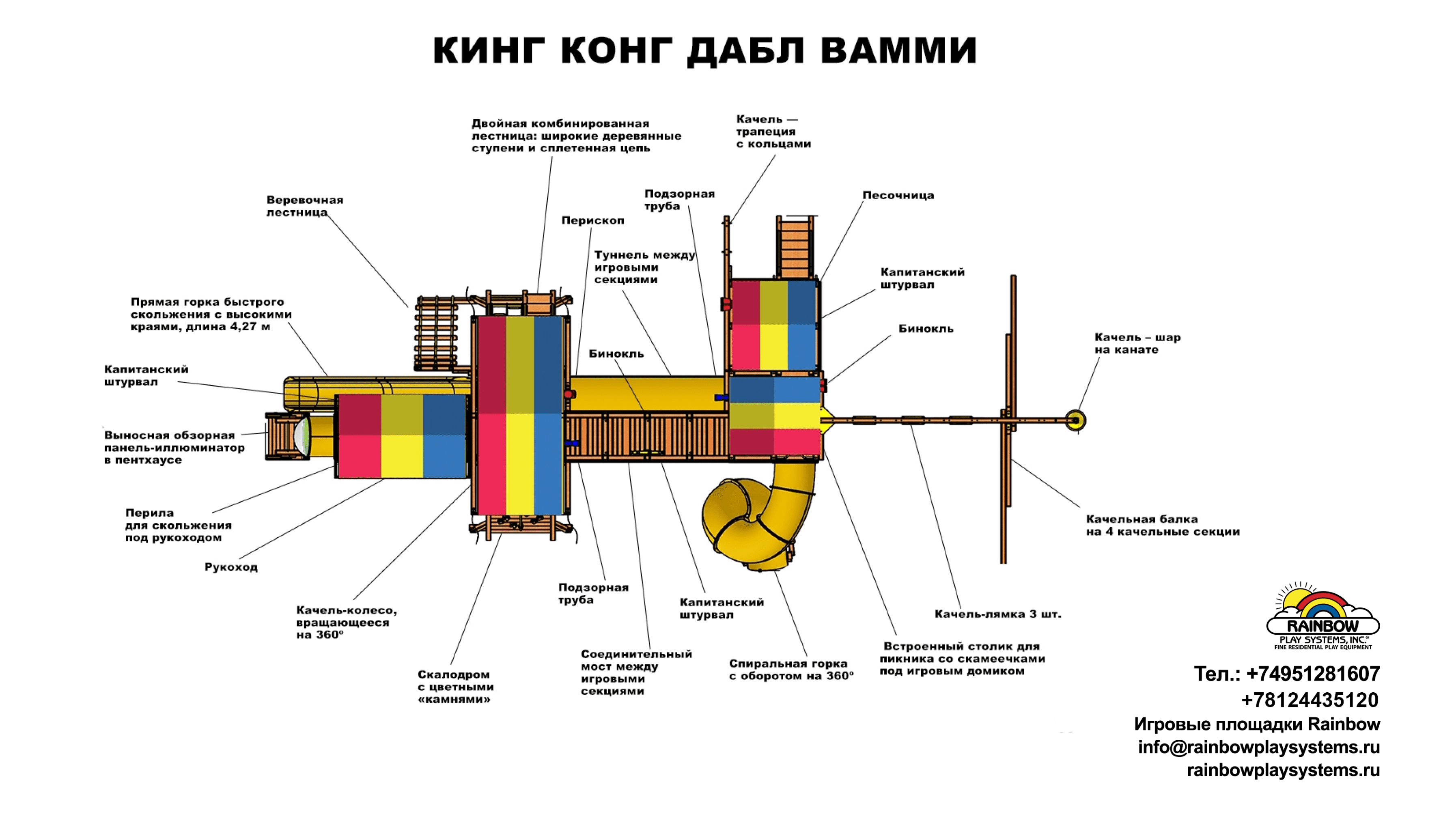 Детская игровая площадка Кинг Конг Дабл Вамми восхищает своей величественностью. Множество игровых зон: наблюдательные вышки, горки, пространство для лазания и огромное разнообразие качелей — дети будут в восторге! Такая игровая площадка будет гордостью любого загородного дома и точкой притяжения всех гостей, как маленьких, так и взрослых. Высота игровых платформ 2,19м, настоящая крепость для игр.