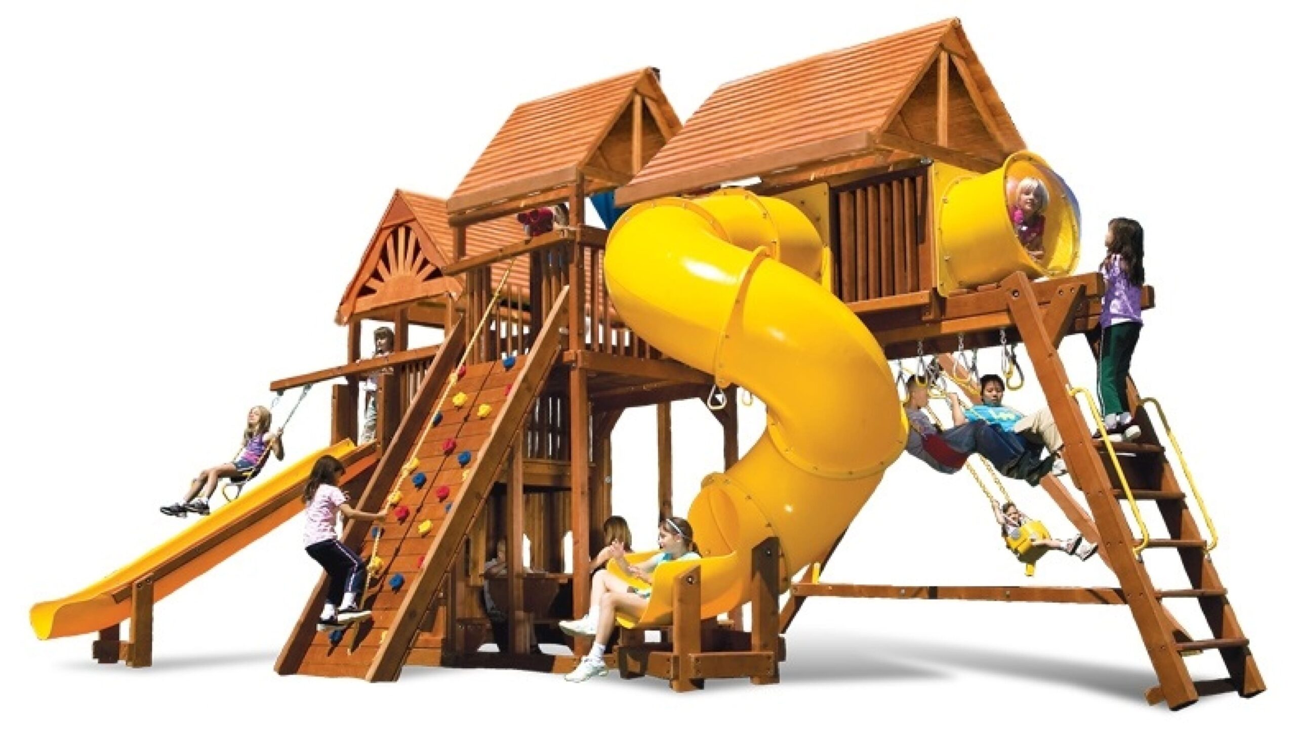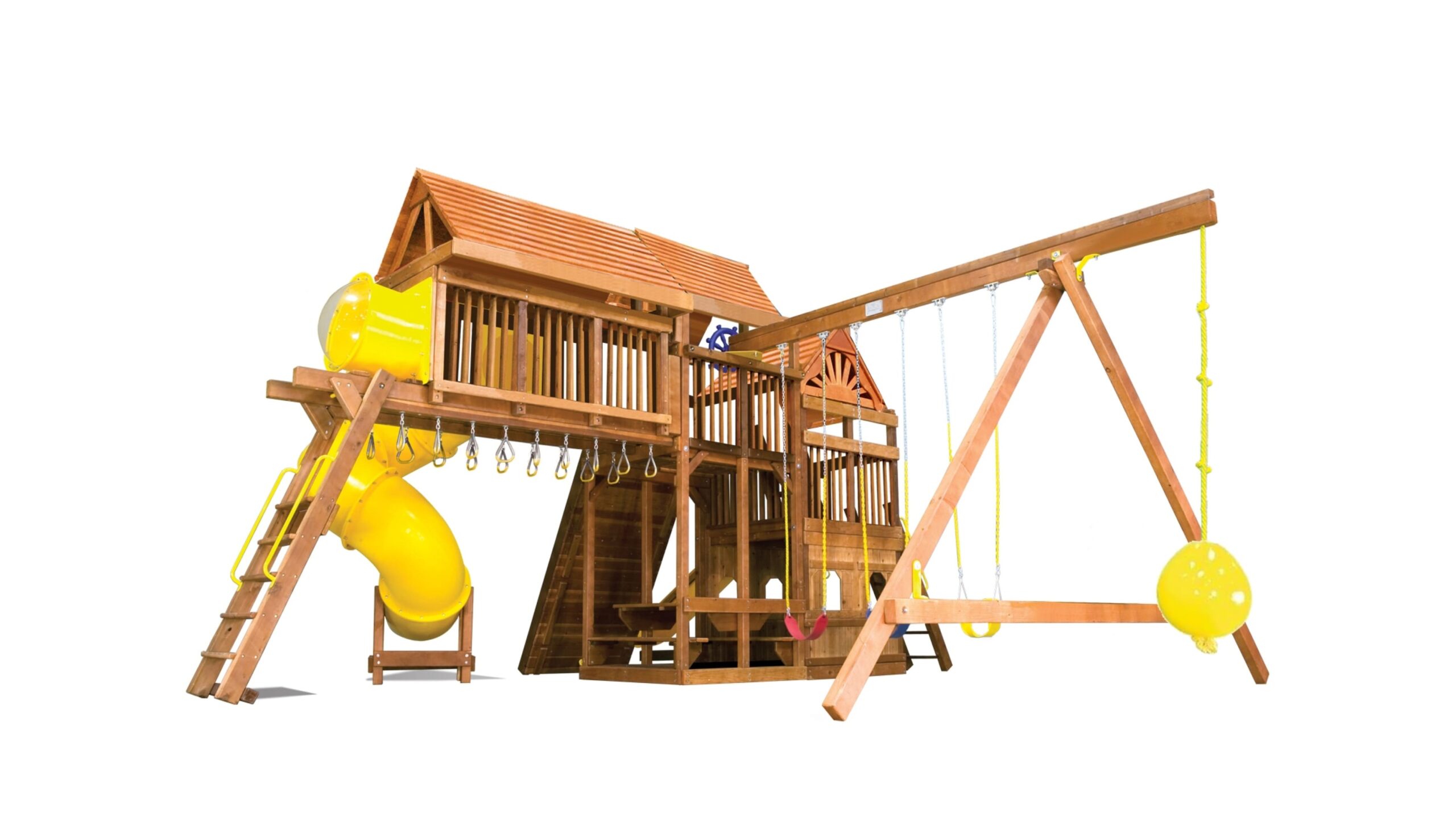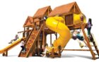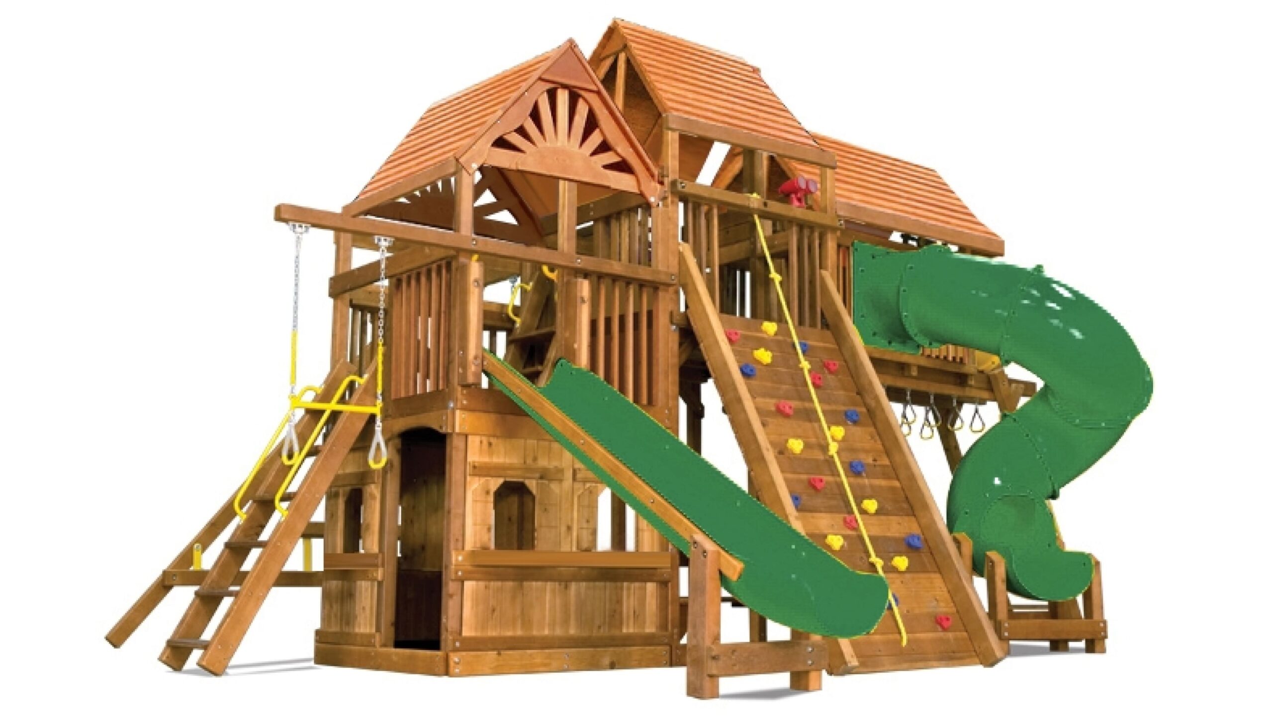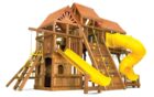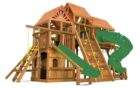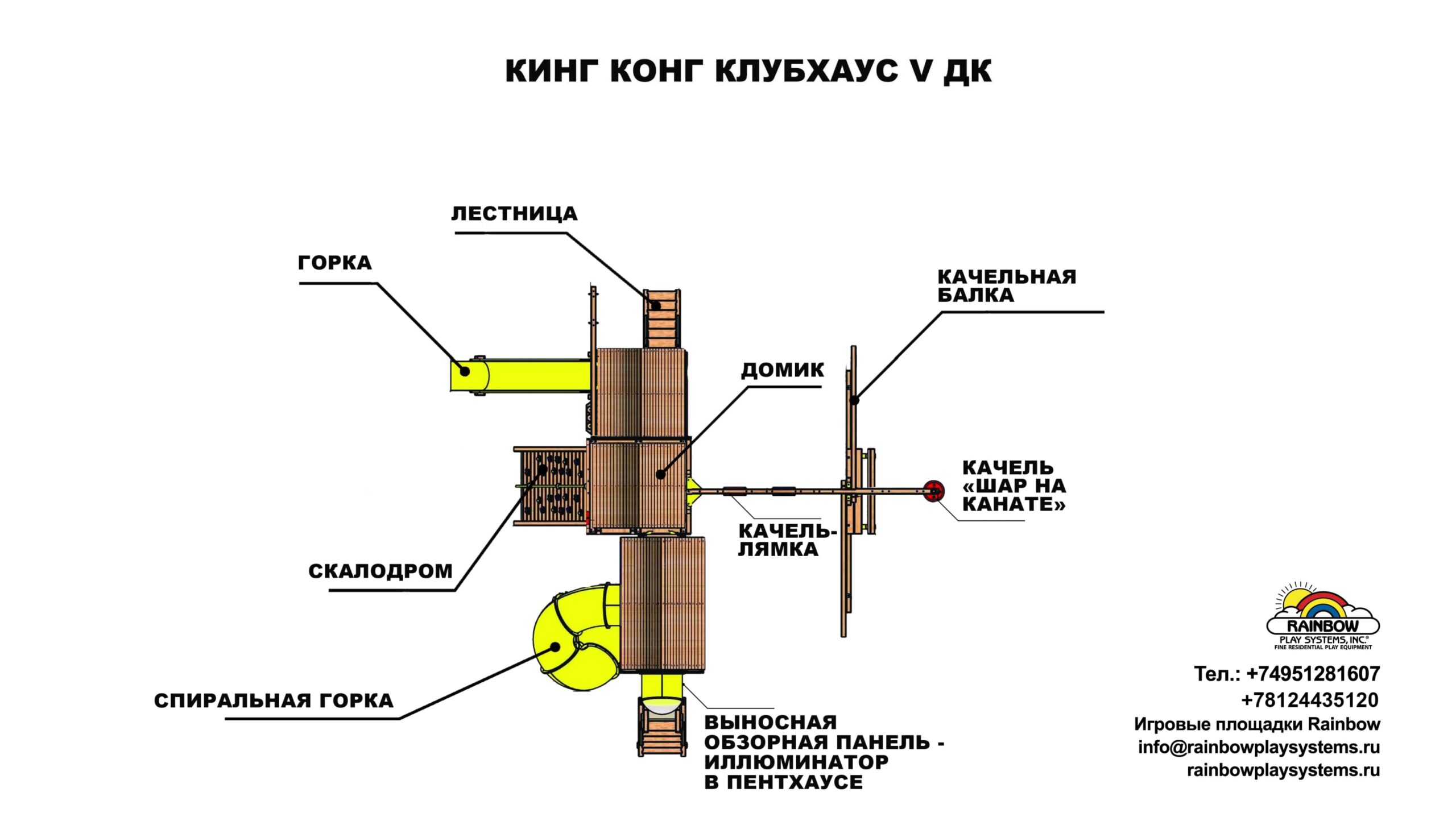 Детский игровой комплекс Кинг Конг Клубхаус V ДК уникален за счет того, что отлично подходит для установки в загородный дом, так и в общественное место. Лаконичный дизайн и продуманные до мелочей игровые зоны делают данный комплекс одним из лидеров среди всех моделей Rainbow Play Systems. Дети в восторге от изысканного закрытого домика в основании, в котором можно прятаться от непогоды, либо от палящего солнечного зноя. Детская площадка сделана из кедра, который прошел 10-ти ступенчатую обработку влагоустойчивыми антисептиками, срок службы дерева при должном уходе не ограничен. Для установки подходит любая ровная поверхность. Данный комплекс весит порядка 2000кг, что придает ему максимальную устойчивость и технически установка не требует бетонирования несущих балок к поверхности.