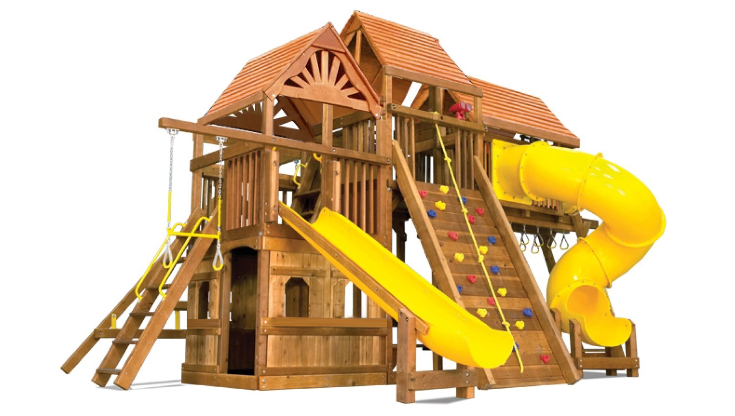 Цельный брус американского и канадского кедра, прошедший десятиступенчатую термообработку фирменными влагоустойчивыми антисептиками. Пластик первой категории качества, нетоксичный, не имеет неприятного запаха и полностью безопасен для детей. Металлические цепи покрыты винилом в местах, где ребёнок может схватить их руками. Бинокли, телескопы и другие аксессуары детализированы и также сделаны из прочного пластика.