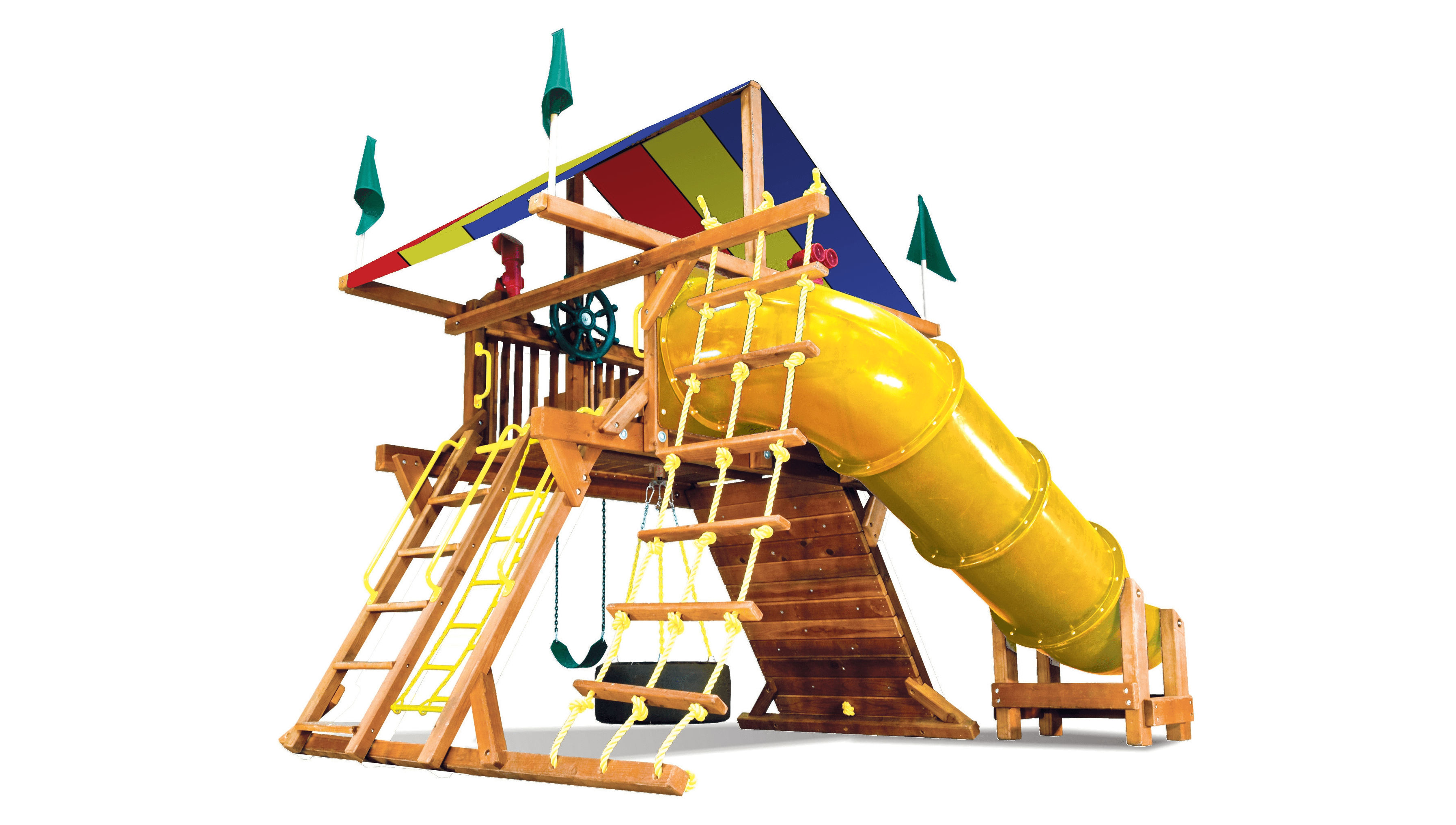 Цельный брус американского и канадского кедра, прошедший десятиступенчатую термообработку фирменными влагоустойчивыми антисептиками. Пластик первой категории качества, нетоксичный, не имеет неприятного запаха и полностью безопасен для детей. Металлические цепи покрыты винилом в местах, где ребёнок может схватить их руками. Бинокли, телескопы и другие аксессуары детализированы и также сделаны из прочного пластика.Комплектация