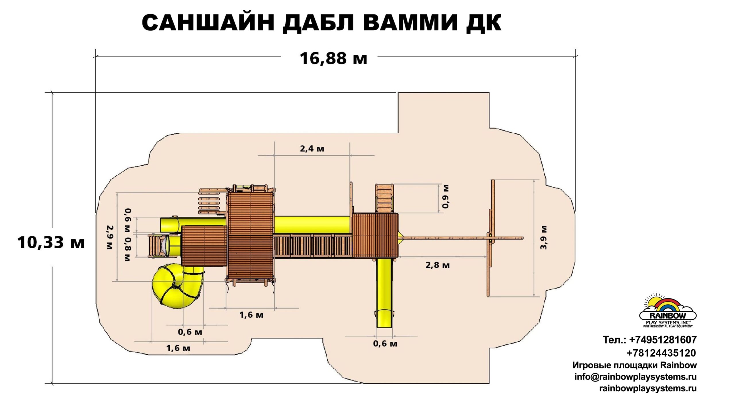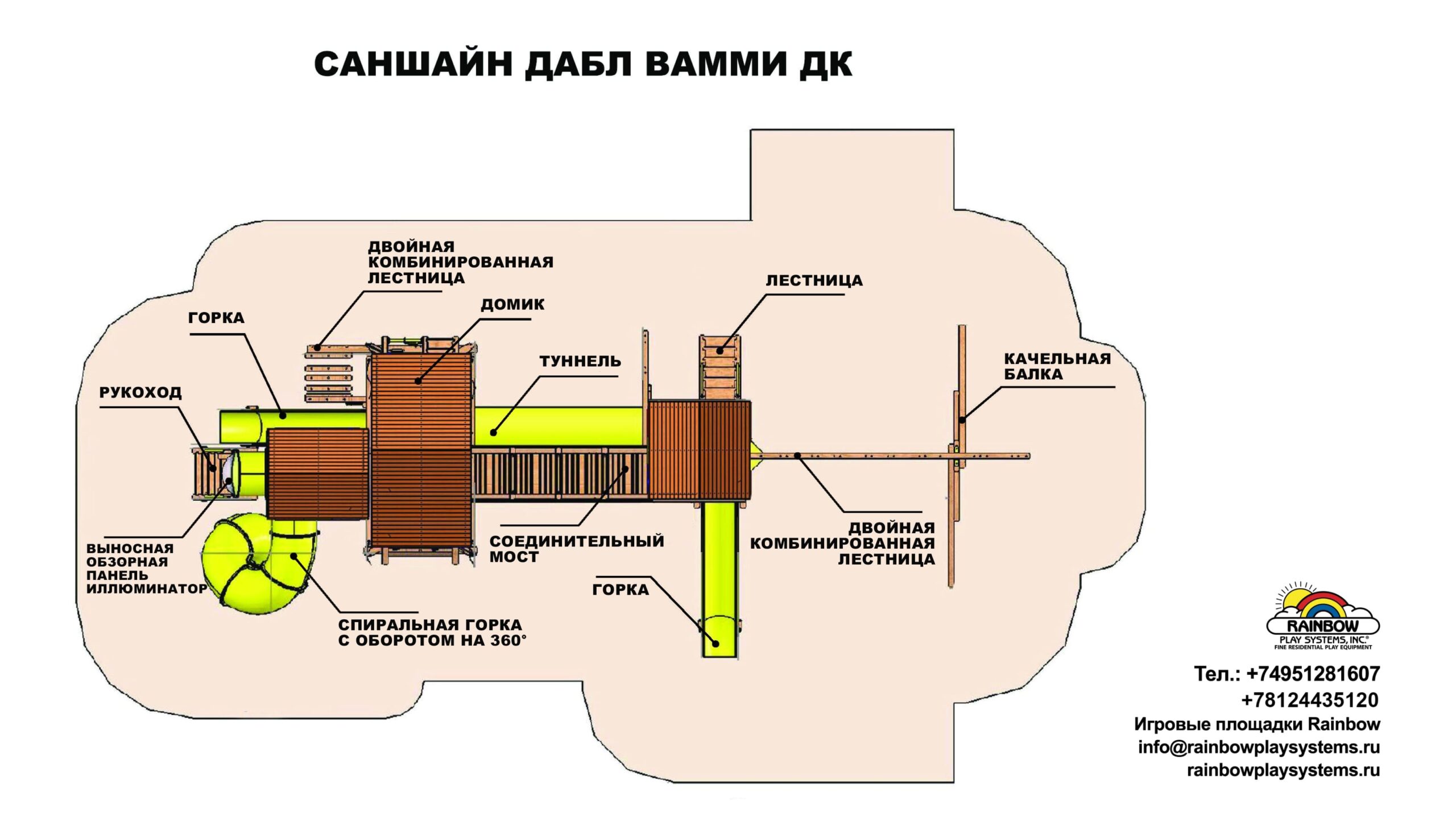 Детская площадка Саншайн Дабл Вамми — это одно из лучших решений, придуманных в мировом производстве детского игрового оборудования. Дабл Вамми это сразу две площадки (формы Кастл и Клубхаус) соединенным между собой деревянным мостом и туннелем из плотного пластика. При этом данный комплекс имеет оптимальные габаритные размеры, которые позволяют разместить его на сравнительно небольшом участке. Саншайн Дабл Вамми выбирают застройщики, архитекторы, компании по благоустройству парков. Также данный комплекс подойдет для установки на территории частного загородного дома.